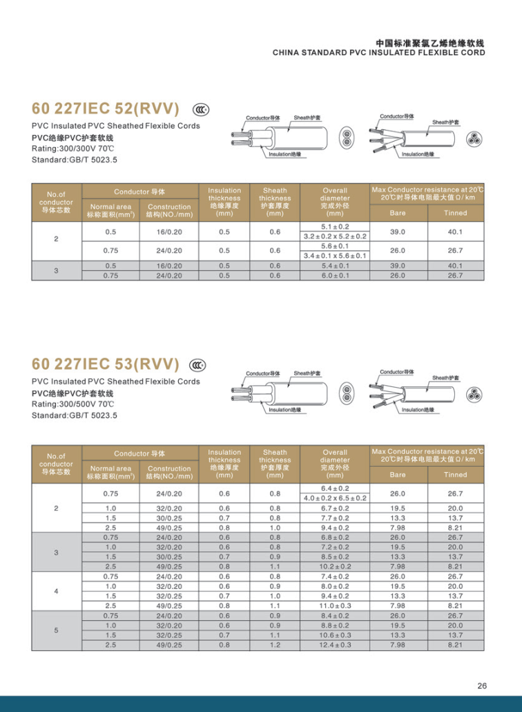 CHINA STANDARD PVC INSULATED FLEXIBLE CORD 60227 IEC 52RVV 53RVV