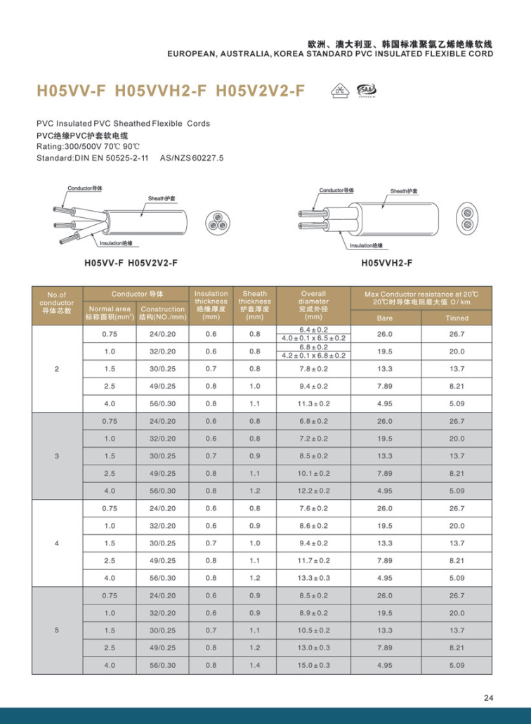EUROPEAN AUSTRALIA KOREA STANDARD PVC INSULATED FLEXIBLE CORD H05VV-F H05VVH2-F H05V2V2-F